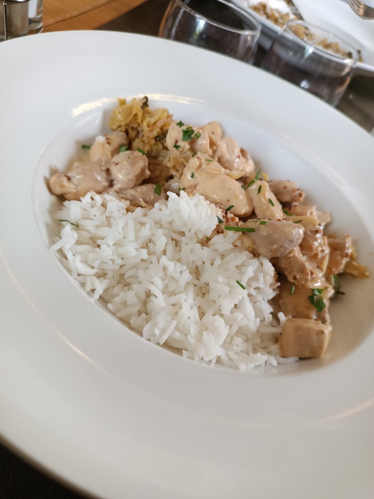 L’atelier est composé d’une équipe en cuisine et en salle. Le restaurant se situe au cœur du village et peut accueillir 25 à 30 couverts. Nous avons pris le menu du jour au restaurant. En entrée nous avons mangé de la rillette de thon marinée aux choux rouge puis nous avons poursuivi avec du riz accompagné de sa viande et du chou. En dessert c’était financier à la noix de coco accompagné de sa glace à la pistache.