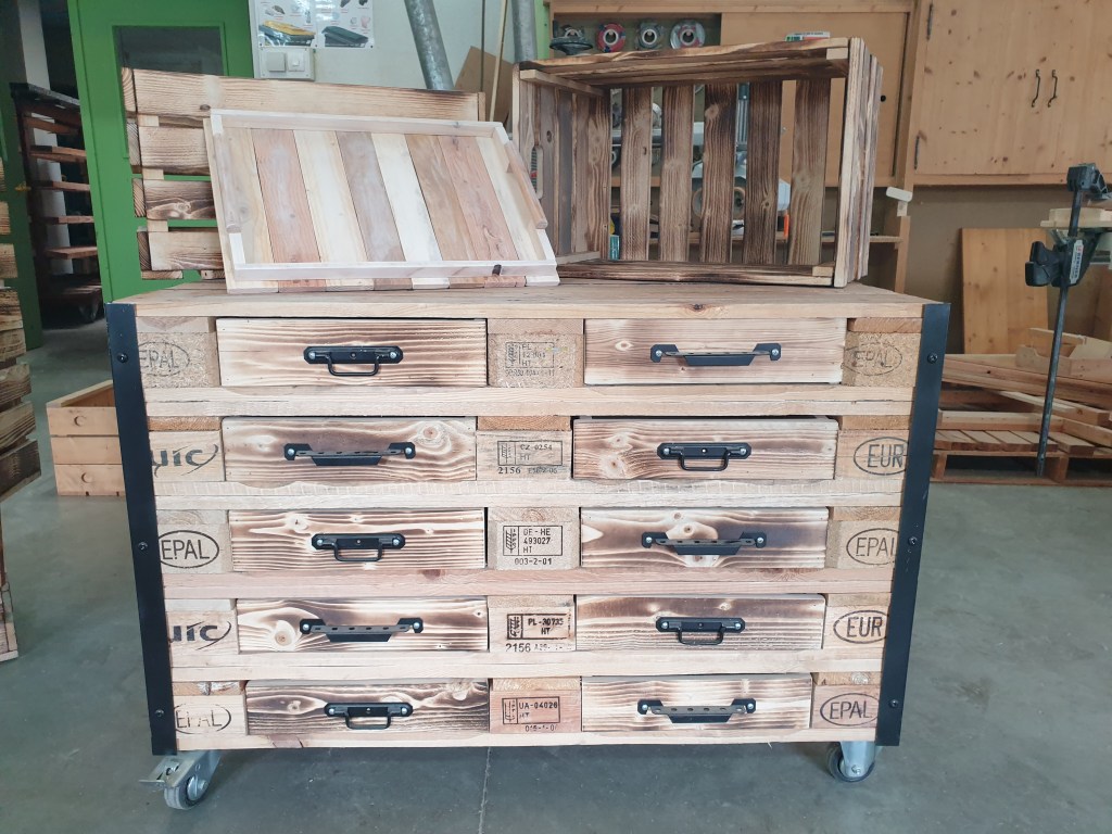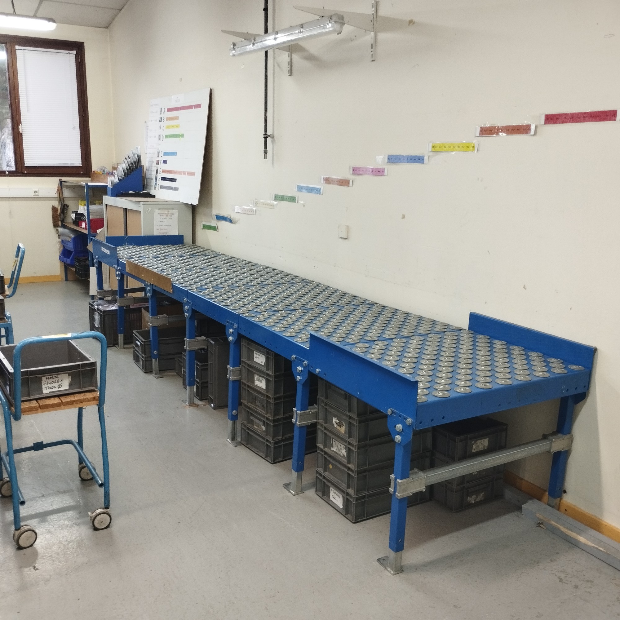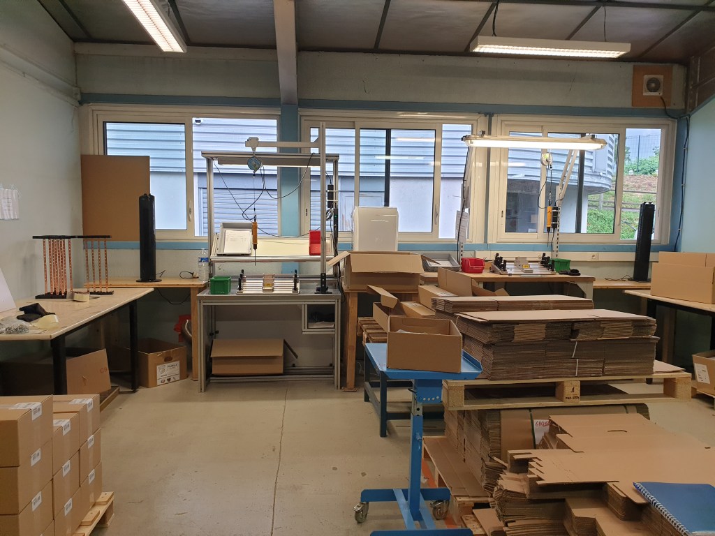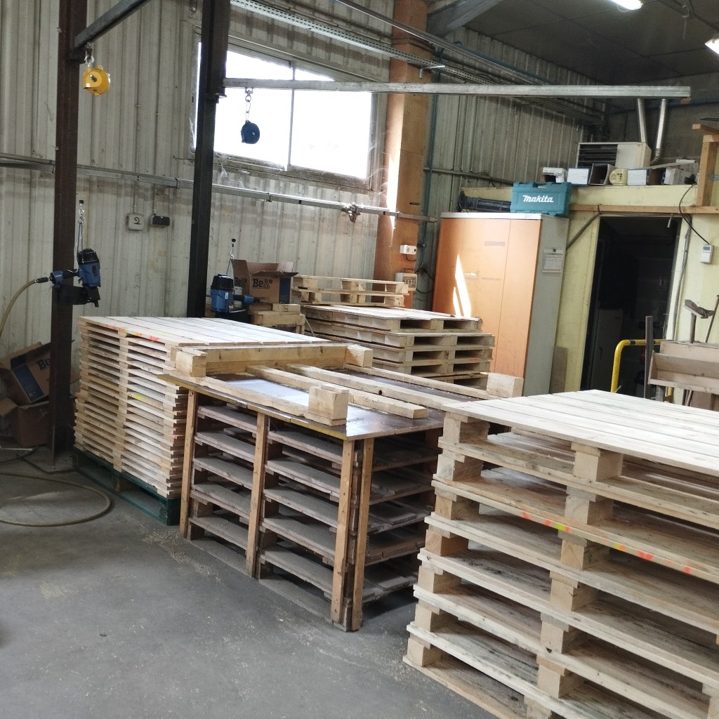 Les palettes sont amenées par les ouvriers du magasin pour faire de la production. Pour les livraisons des palettes les ouvriers du magasin vont dans l’atelier les récupérer pour les filmer pour le départ chez le client. Une partie de la production est du travail sur table pour faire des sous ensembles. Qui serviront pour compléter une commande.