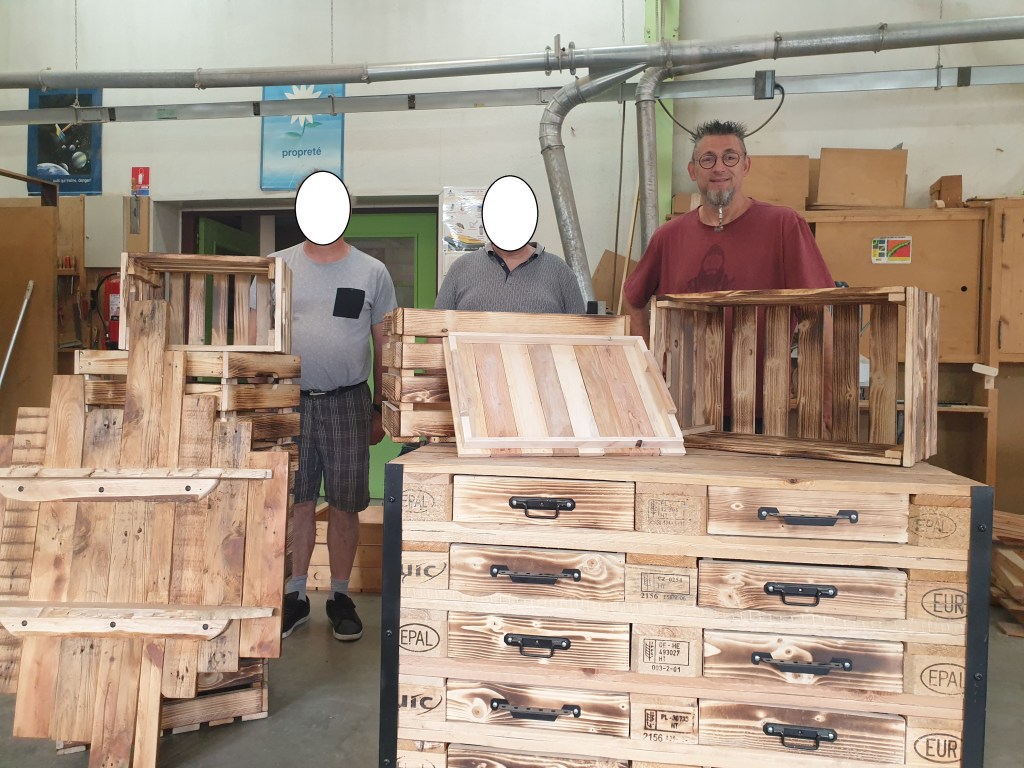 Dans l’atelier, il y a deux moniteurs et il y a 10 ouvriers. Il y a des personnes qui sont à mi-temps et qui travaillent 3 jours par semaine.