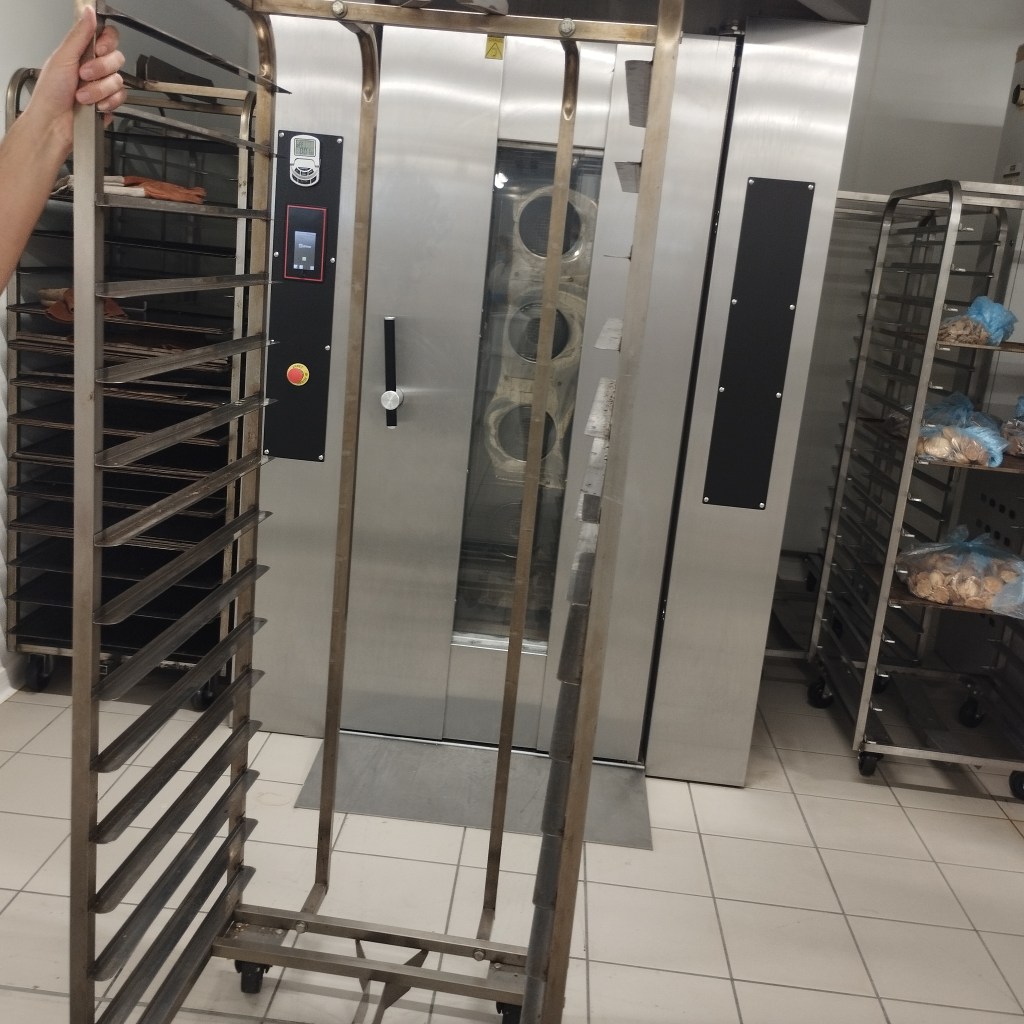 Puis dans le four les gâteaux restent 14 minutes pour la cuisson. Le chariot est sorti du four est entreposer pour que les gâteaux puissent refroidir. Au total 1800 gâteaux qui sont cuits pars chariot.