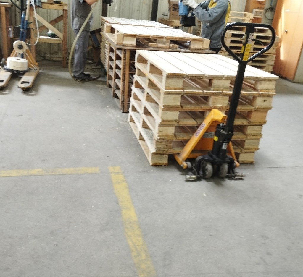 Le matériel utilisé dans l’atelier est une scie sur table pour couper les planches à la bonne longueur, il y a un gros compresseur pour les cloueurs. Il y a des gabarits pour faire les palettes à la bonne taille. Ils ont un gerbeur électrique plus un chariot élévateur et des transpalettes. Il y a une tenue de sécurité ils ont des chaussures de sécurité, un casque anti bruit, des gants, des lunettes. Ecrit par UGO